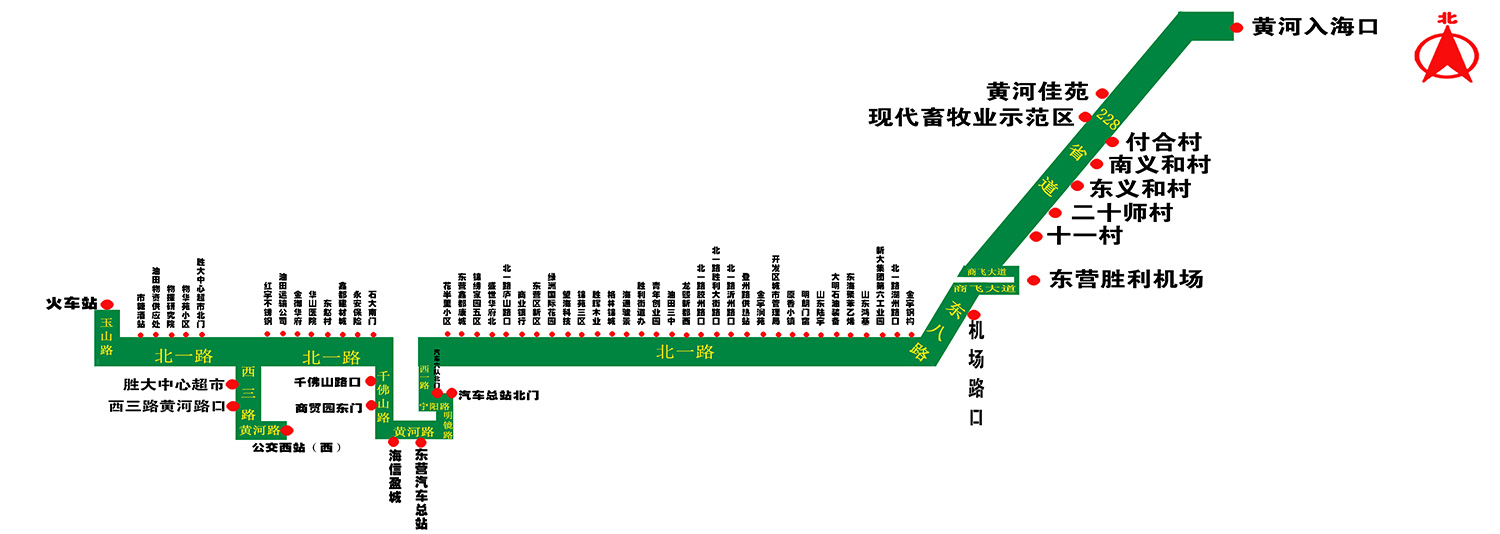 下行自公交西站始發(fā),經(jīng)黃河路、西三路、北一路、玉山路(火車站調(diào)頭)、北一路、千佛山路、黃河路、明鏡路、寧陽路、西一路、北一路、東八路、商飛大道(勝利機(jī)場調(diào)頭)、東八路、228省道、024鄉(xiāng)道到達(dá)終點(diǎn)站“黃河入海口”;上行按上述路線返回。