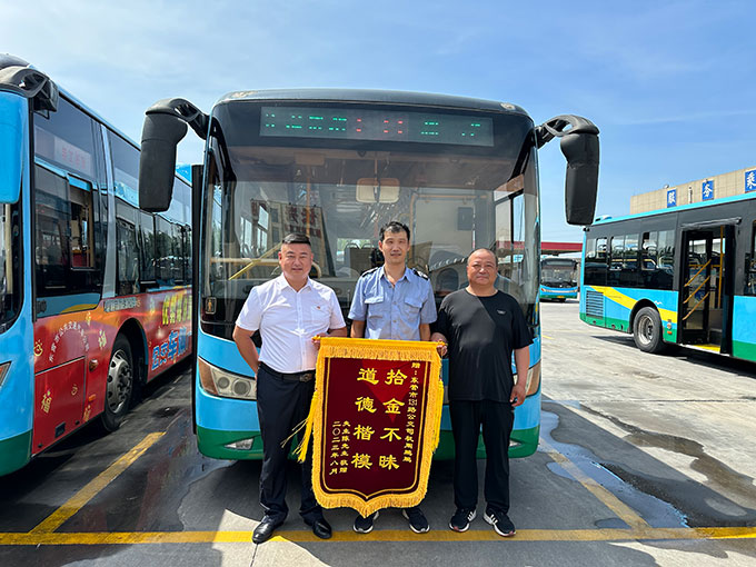 8月1日,陳先生將一面寫有“拾金不昧,道德楷?!钡腻\旗送到市公交集團汽車六隊,感謝131路駕駛員周鵬鵬師傅拾金不昧。 7月30日,陳先生不慎將自己的手機遺漏在131路上,駕駛員周鵬鵬發(fā)現后第一時間把手機帶回車隊,此時手機失主家屬打來電話。經溝通,家屬得知是公交駕駛員撿到,連聲道謝并詢問了車隊地址,匆忙來尋找。經車隊運行隊長徐小樹核實后,將丟失的手機歸還給失主家屬。陳先生為表謝意,專程送來錦旗。