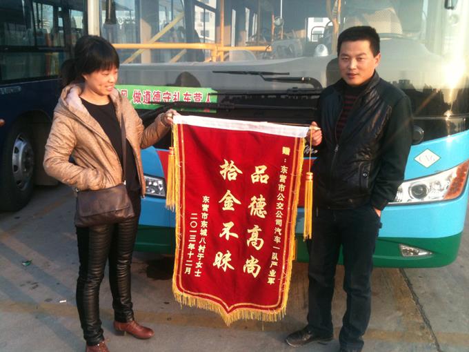 2013年12月5日,東城八村乘客于小梅女士拿著一面寫有“拾金不昧、品德高尚”的錦旗來到市公交公司汽車一隊,感謝車隊嚴(yán)業(yè)軍師傅拾金不昧的高尚品德。