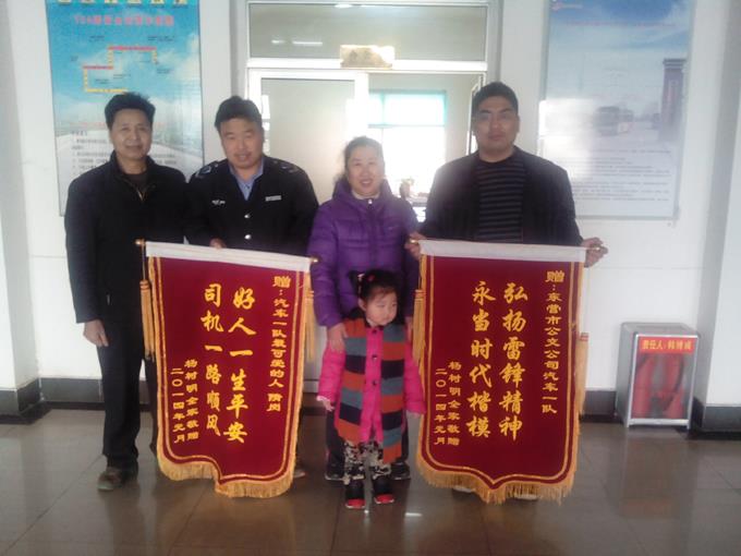 1月27日上午,一位楊先生攜全家激動的來到市公交公司汽車一隊,雙手捧著兩面錦旗向駕駛員隋崗和車隊表示感謝。