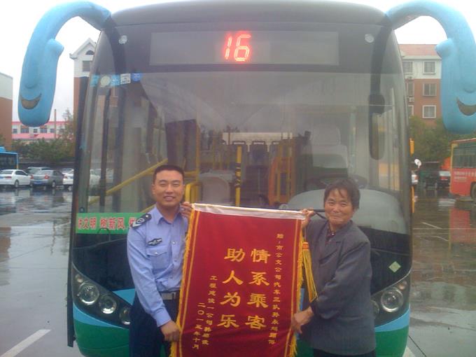 10月14日下午,一位老太太拿著一面寫有“情系乘客,助人為樂”的錦旗,來到市公交公司汽車三隊辦公室,對16路駕駛員孫永超表示致謝,也為公交公司和車隊培養(yǎng)了如此優(yōu)秀的員工表示敬意……