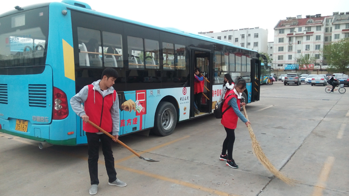 來自東營(yíng)職業(yè)學(xué)院青年志愿者協(xié)會(huì)的學(xué)生和市公交公司汽車一隊(duì)職工共計(jì)30余人,分成兩個(gè)小組,一組打掃停車場(chǎng)衛(wèi)生,撿拾地上果皮紙屑,另外一組幫助駕駛員擦拭車身,清掃車廂衛(wèi)生。大家干得熱火朝天,不到兩個(gè)小時(shí),公交車和停車場(chǎng)被大家打掃得干干凈凈。
