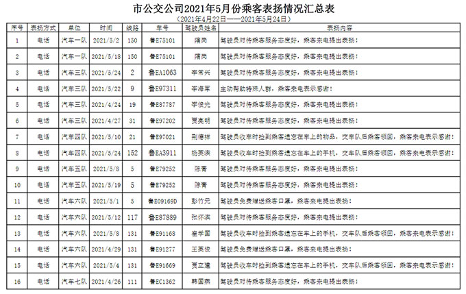 廣大駕駛員要以受到表揚的同志為榜樣,愛崗敬業(yè)、無私奉獻(xiàn),為樹立和維護(hù)公司的外在形象作出貢獻(xiàn)。同時也希望受到表揚的同志戒驕戒躁,再接再厲,發(fā)揮模范作用,繼續(xù)為公司的服務(wù)提升工作貢獻(xiàn)力量。