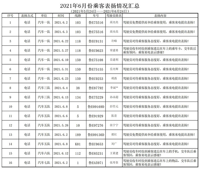 近段時(shí)間以來(lái),廣大駕駛員按照公司的部署,在做好疫情防控的同時(shí),積極投身公交服務(wù)質(zhì)量提升工作。經(jīng)過(guò)持續(xù)不斷的努力,公交服務(wù)質(zhì)量明顯提高,涌現(xiàn)了一大批的好人好事,受到乘客的好評(píng)。為繼續(xù)提高工作積極性,形成“比、學(xué)、趕、幫、超”的良好氛圍,現(xiàn)將2021年5月24日至2021年6月24日期間通過(guò)公交服務(wù)熱線受到乘客表?yè)P(yáng)的駕駛員予以通報(bào)。