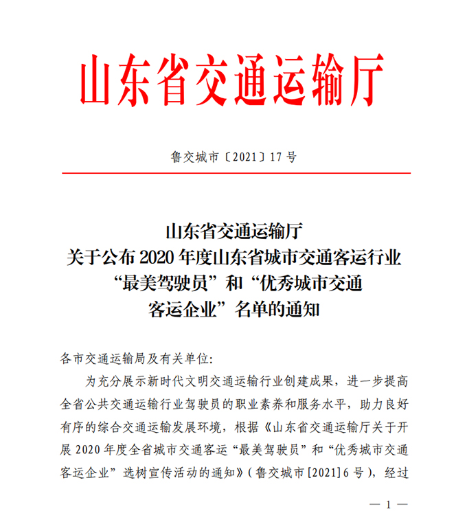 為充分展示新時代文明交通運輸行業(yè)創(chuàng)建成果,進一步提高全省公共交通運輸行業(yè)駕駛員職業(yè)素養(yǎng)和服務水平,助力良好有序的綜合交通運輸發(fā)展環(huán)境,根據(jù)《山東省交通運輸廳關于開展2020年度全省城市交通客運“最美駕駛員”和“優(yōu)秀城市交通客運企業(yè)”選樹宣傳活動的通知》(魯交城市〔2021〕6號)要求,經(jīng)活動啟動、材料申報、資格審查、公開公示、人選推薦、專家評審等環(huán)節(jié),產(chǎn)生了優(yōu)秀城市交通客運企業(yè)和城市交通客運最美駕駛員名單,市公交公司及兩名駕駛員榜上有名。