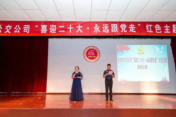 為迎接黨的二十大勝利召開,更加深入學(xué)習(xí)貫徹省十二次黨代會精神,集中展現(xiàn)新時期公交干部職工在各自工作崗位上的新作為、新?lián)敗⑿伦藨B(tài),引導(dǎo)公司干部職工更加堅定理想信念,在“七一”建黨節(jié)來臨之際,市公交公司于6月30日上午組織開展了“喜迎二十大·永遠跟黨走”紅色主題誦讀比賽活動。市交通運輸局直屬機關(guān)黨委專職副書記趙秀來同志到場指導(dǎo),市公交公司黨委委員、工會主席蔣積堯,黨委委員、辦公室主任劉玉忠等出席活動。