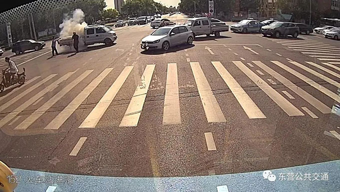 7月15日15:40分左右,東營市公交公司汽車四隊(duì)張學(xué)成師傅駕駛152路公交車行駛至北一路與西二路路口等紅燈時,發(fā)現(xiàn)前方一輛私家車后斗著火,火苗竄得很高。張師傅見狀急忙拿著車內(nèi)滅火器跑下車去,對著著火處進(jìn)行滅火。