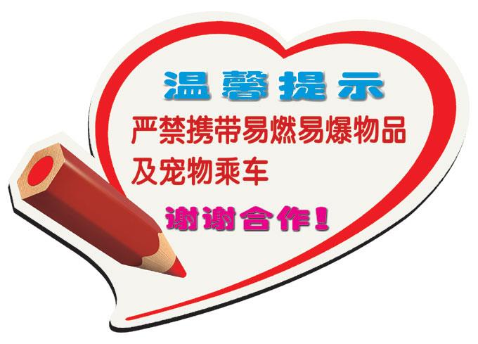 為了深入貫徹落實(shí)“兩保兩樹”活動精神,切實(shí)做到保乘客安全,樹公交形象,近日,市公交公司廣告部陸續(xù)在公交車身廣告畫面的車前門上車處添加了溫馨提示語,提醒廣大乘客不要攜帶易燃易爆等危險品及寵物乘坐公交車。提示語以白色心形為底色,加以紅色文字,既美觀醒目,規(guī)范統(tǒng)一,又很好地喚起了乘客的公共安全意識,確保了市民的出行安全。