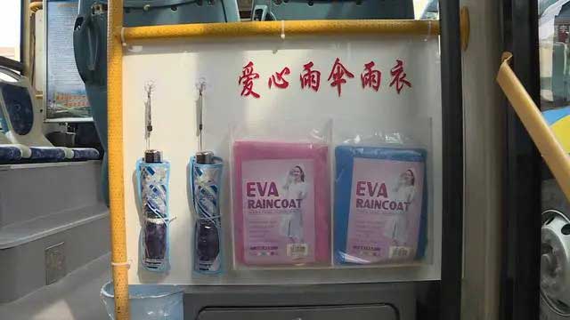 在東營市公交公司汽車三隊停車場,駕駛員李斌像往常一樣,把自己駕駛的38路公交車仔仔細細打掃了一遍。記者在他的車上,還看到了一些特別的便民物品:前排的礦泉水、藥箱,后排的便民雨傘、雨衣。李斌告訴記者,這些都是他自己購置安裝的,就是為了方便乘客。